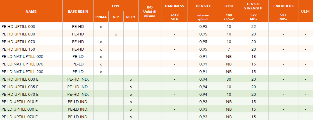UPLTILL è la nostra gamma di compound di PoliEtilene nelle versioni Low Density e High Density, che comprende gradi caricati con cariche minerali in diverse percentuali, antifiamma o additivati, anche in versioni rigenerate certificate “plastica seconda vita”. Neri, naturali o a colore campione.